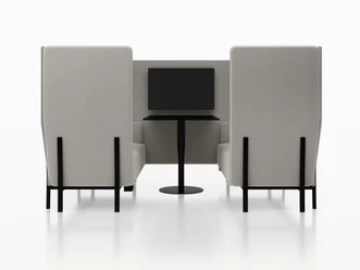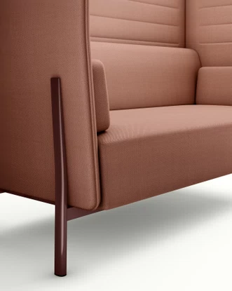 Die an den Aluminiumbeinen fixierten seitlichen und rückwärtigen Paneele der verschiedenen Modelle prägen die Polstermöbel-Kollektion ELEVEN HIGH BACK. Ihre vielseitige Natur zeigt sich in der Ausführung "Privacy", eine intime und funktionale, leichte Architektur, die entsteht, indem zwei Sofas einander gegenüber aufgestellt werden und eine Seite mit einem Paneel verschlossen wird. Eine natürliche Ergänzung ist die Variante Eleven high back work, bei der eine Arbeitsfläche eingefügt wird, die das Sofa in eine Office Capsule verwandelt. Diese ermöglicht es dem Benutzer, seine Tätigkeit in den modernen Softseating-Bereichen von Lounges, Flughäfen und Hotels fortzusetzen. ELEVEN HIGH BACK bietet in seinen zahlreichen Varianten flexible und raffinierte Lösungen für die unterschiedlichen Anforderungen zeitgenössischer Umgebungen.