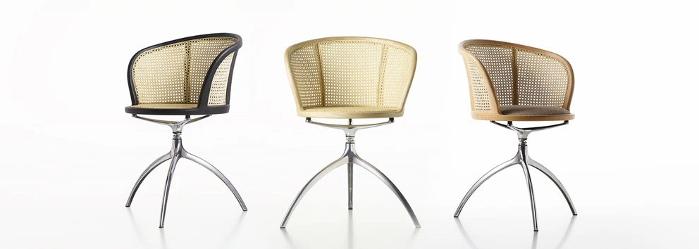Im Entwurf des Sessels verschmelzen in einem Prozess der Hybridisierung zwei nur scheinbar formal unterschiedliche Teile miteinander: das Drehgestell mit drei Beinen aus leichtem Aluminiumdruckguss mit sichtbarem Dämpfungsmechanismus und die gemütliche Schale aus Wiener Geflecht, die über einen heiß gebogenen und bearbeiteten Rahmen aus Massivholz gespannt ist.