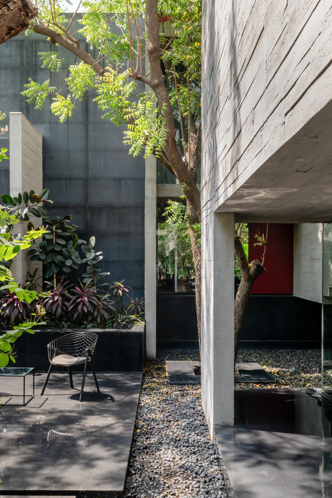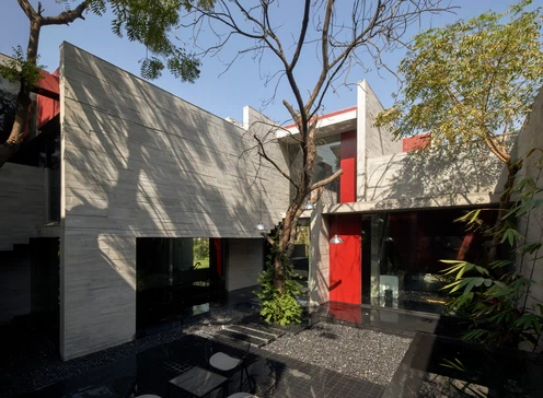 Trees Sliced Through ist ein Privathaus, das sich in einer Wohnsiedlung an einer belebten Geschäftsstraße in Ahmedabad, Indien, befindet. Auf dem 1000 m² großen Grundstück standen 23 große Neembäume. Alle wurden erhalten und ihre natürliche Position spiegelt sich in der Gestaltung des Hauses wider.