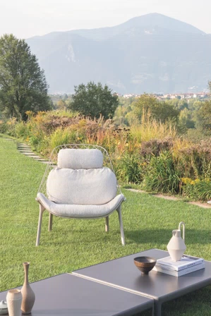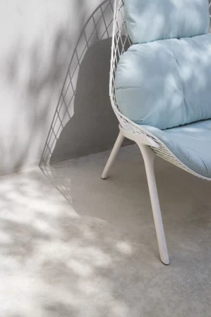 Als Loungesessel mit großzügigen Abmessungen garantiert Gran kobi outdoor maximalen Komfort und fügt sich auf vielseitige Weise in Outdoor-Bereiche ein. Gran Kobi greift dieselbe Ästhetik der Indoor-Variante auf und besitzt eine rigorose und gemütliche Schale, die aus einem Geflecht aus geschweißtem Rundstahl entsteht. Der Träger aus Aluminiumguss umschließt die Sitzfläche elegant und hüllt die Form gänzlich ein. Ein Ensemble aus Kissen ergänzt den Sessel im Sinne von Komfort und Funktionalität.