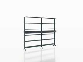 Regal aus fliessgepressten Aluminiumteilen und Tablaren aus lackiertem Aluminium und Schubladen aus lackiertem MDF mit der Tiefe 36 cm. Höhenverstellbare Füsse aus matt eloxiertem Aluminium.