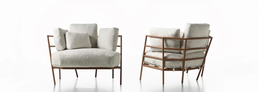 Die Kollektion DEHORS, die für die Gestaltung eines authentischen “Salons im Garten“ konzipiert ist, inspiriert sich passend zum Thema an der Natur und der unregelmäßigen Form von Pflanzen. Die Trägerstrukturen weichen von den gewohnten Vertikalen ab. Das Ergebnis ist eine bewegte Struktur, die sich von jeder architektonischen Regel befreit und gleichzeitig eine unerwartete Bequemlichkeit und ein optisches Interesse bietet.