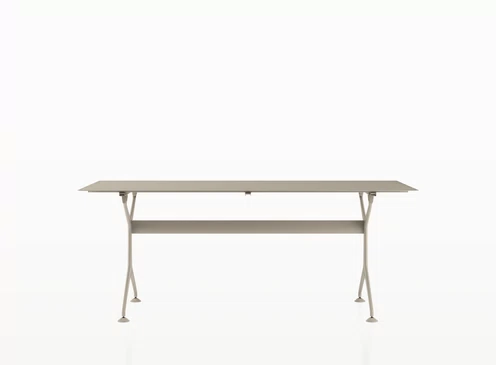 Tisch für den Außenbereich mit Tragestruktur bestehend aus lackierten Aluminiumdruckgußelementen. Platte aus lackierten fliessgepressten Aluminiumdauben.