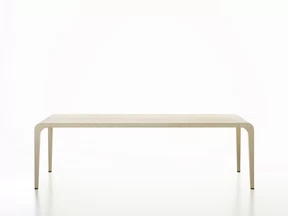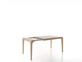 Tisch mit Struktur aus massivem Ahorn oder Esche. Ahorn furniert oder Eiche furniert. Innenfüllung des Beins aus eingespritztem Polyurethan. Ausführung in transparent lackiertem Eichenfurnier oder gebeiztem Eichenfurnier (Stärke der Platte 5 cm).