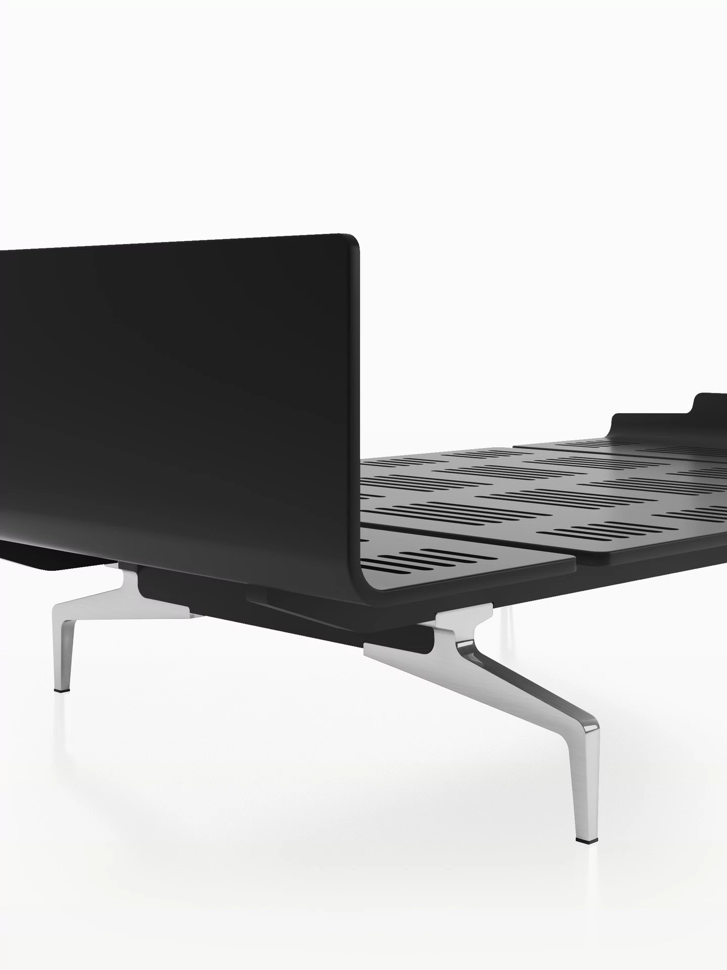 Bett mit Kopfteil mit mittlerer Kante und Fußteil mit niedriger Kante matt lackiert oder Holzfurniert; Füße aus poliertem oder lackiertem (gerauht oder glänzend) Aluminiumdruckguß.