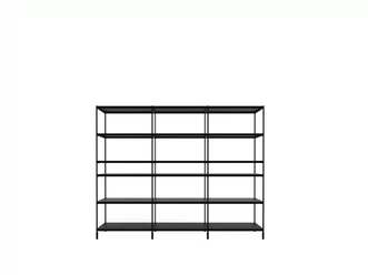 Regal aus fließgepressten lackierten Aluminiumteilen. Tablare aus MDF mit Eichenfurnier (Eiche natur oder Eiche aschgrau).