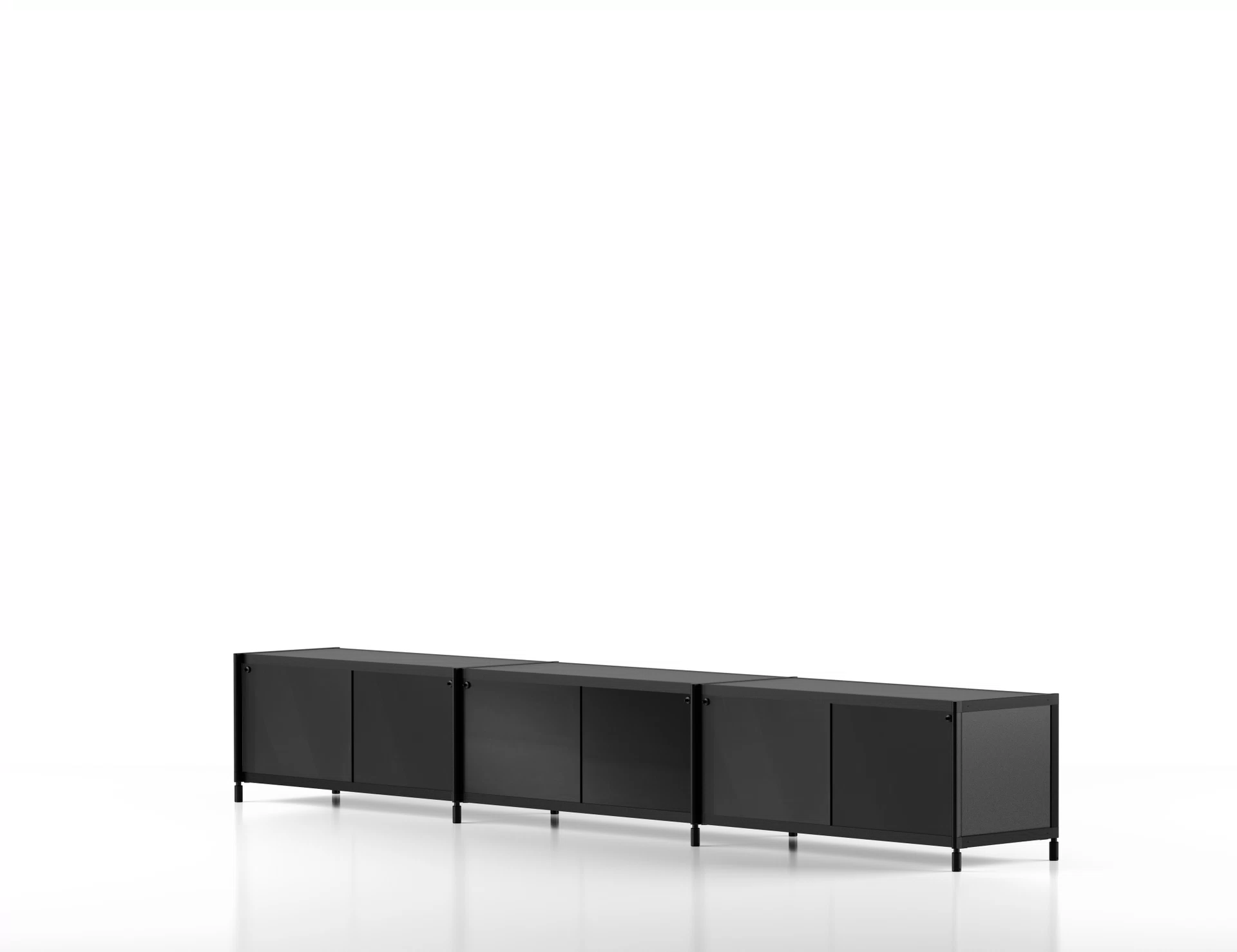 Sideboard aus fließgepressten lackierten Aluminiumteilen und Tablare aus Metall lackiert. Schiebetüren, Seiten- und Rückwände aus glänzend lackiertem Acrylglas.