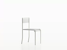 Stapelbarer Stuhl mit Gestell aus Stahl verchromt oder lackiert, Sitz und Rückenlehne aus PVC-Schnur.