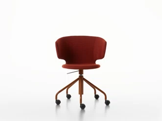 Höhenverstellbarer Dreharmstuhl auf Fünfsternfu mit weichen Rollen. Gestell aus Stahl lackiert und Schale aus Kunststoffmaterial in Verbund mit Polyurethanschaum FCKW frei, abziehbarer Bezug aus Stoff, Kunstleder oder aus Leder.