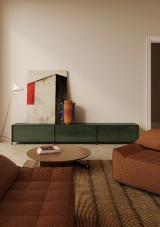 SAVOY comes in three versions with different shapes and sizes, which can be coordinated with each other. The elegantly and dynamically designed leg is composed, in the different heights, of a vertical MDF element – veneered or lacquered – coordinated with the top. Lacquered steel details, attached to the end of this element, provide stability to the various tables.