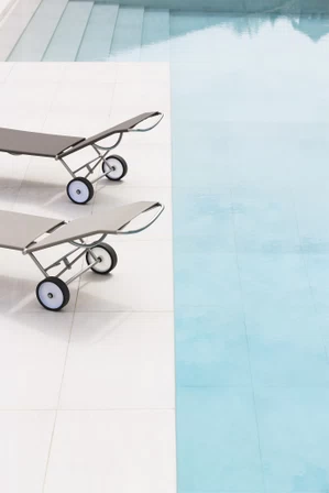 The collection also includes an elegant lounger, the distinctive feature of which is the design of the large wheels inspired by the cart wheels used by caddies on golf courses.