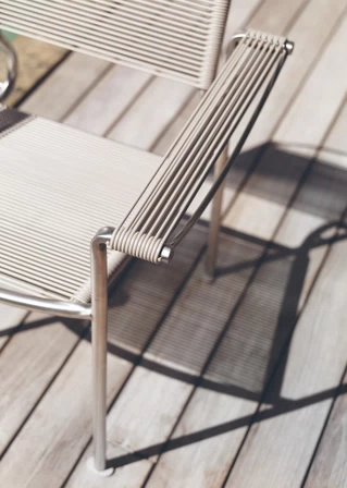 The classic PVC rod weaving of the Spaghetti chair is reinterpreted in the GREEN PVC outdoor collection. Available in different types - stackable chair, armchair and stools - GREEN PVC is characterised by a brushed or painted stainless steel frame, which becomes the frame on which the characteristic cord is woven by hand, creating comfortable seats and backrests. An iconic design that combines functionality, practicality and strength.