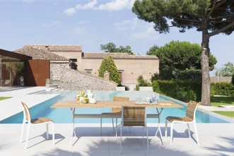 The TECH WOOD collection of chairs, with or without arms, and tables recalls the material essence of the Setes bench, which won the “Una panchina per Milano” (A bench for Milan) contest in 2005. Made with slats of teak wood or heat-treated ash-wood on a die-cast aluminium frame, the products of the Tech Wood collection are wear-resistant and pleasing to the touch. Ideal for open spaces, terraces and gardens, the products that make up the entire family add solidity and attention to detail to the outdoor landscape.