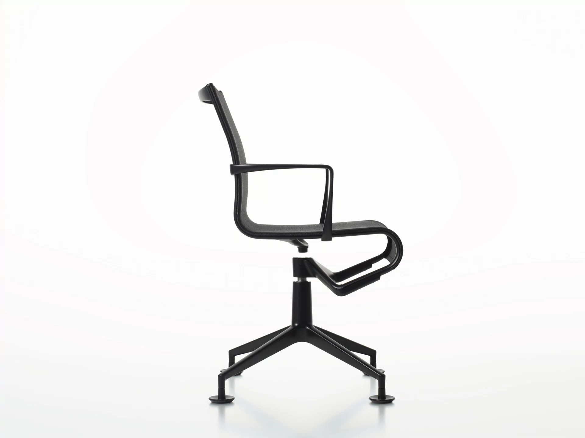 Swivel chair with arms with return mechanism on 4-star base with glides. Structure made of extruded aluminium profile and die-cast aluminium elements. Seat and back in PVC covered polyester mesh, in eco-leather Serge Ferrari®, in fabric Camira®, Reviva® or Kvadrat® or in Pelle Frau® leather.