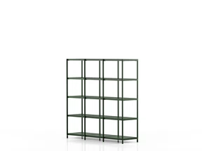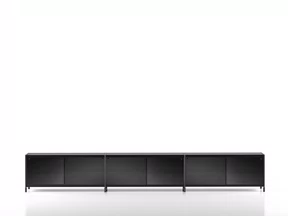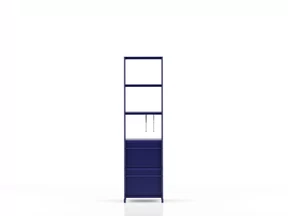 Bookshelf with structure in lacquered extruded aluminium and lacquered metal shelves. Sliding panels, side and back panels in gloss lacquered methacrylate.