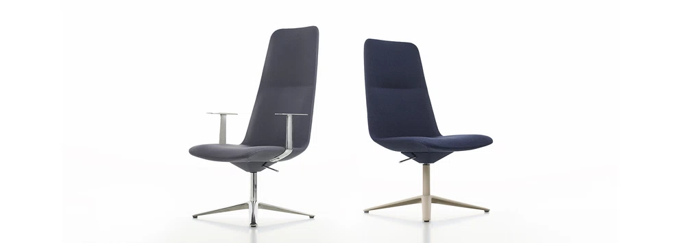 Idéales pour les espaces de réunion, elles sont dotées d'un mécanisme d'oscillation harmonique avec un levier qui permet de bloquer et de régler la hauteur. L'assise et le dossier constituent une unique pièce. La coque, disponible en deux tailles, avec dossier moyen ou haut, est fixée sur un élégant piètement à quatre branches en aluminium.