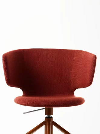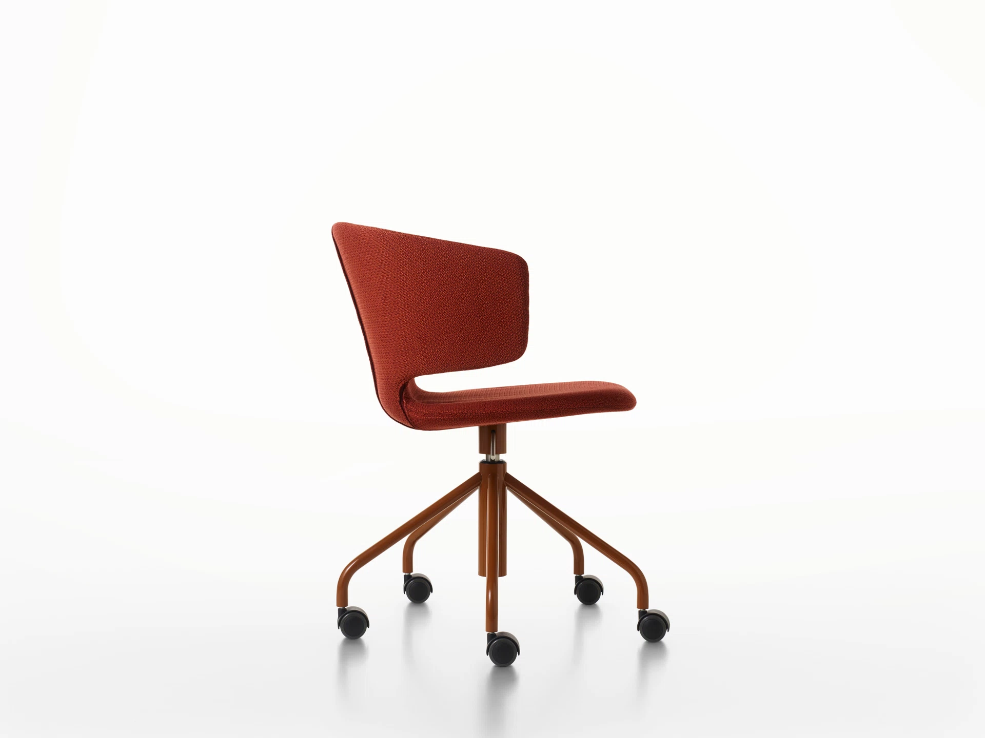 Chaise avec accoudoirs sur roulettes souples à hauteur réglable avec base tournante à 5 branches, structure en acier laqué. Coque en matériau plastique structural couplé à du polyuréthane expansé sans CFC, revêtement déhoussable en tissu, simili cuir ou en cuir.