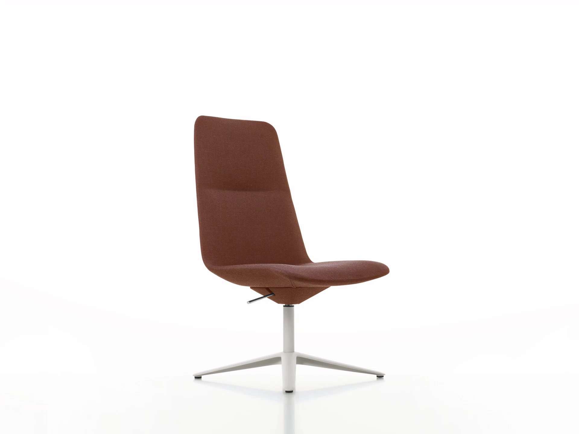 Poltrona ad altezza regolabile con base girevole a 4 razze con meccanismo tilt. Base in alluminio pressofuso verniciato, lucidato o cromato. Scocca in poliuretano stampato e struttura in metallo con rivestimento in ecopelle Serge Ferrari®, tessuto Camira®, Reviva® o Kvadrat® o pelle Pelle Frau®.